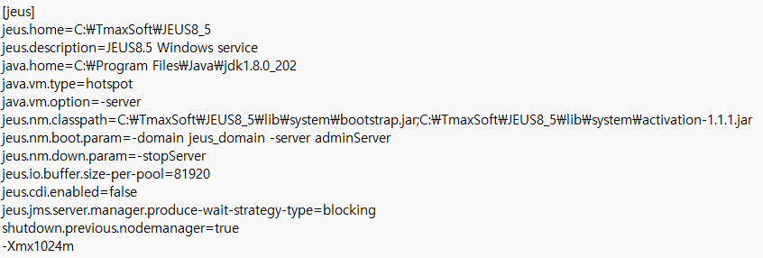 Windows 서비스 이용 시 jeus.ini 설정에 들어갈 수 있다.