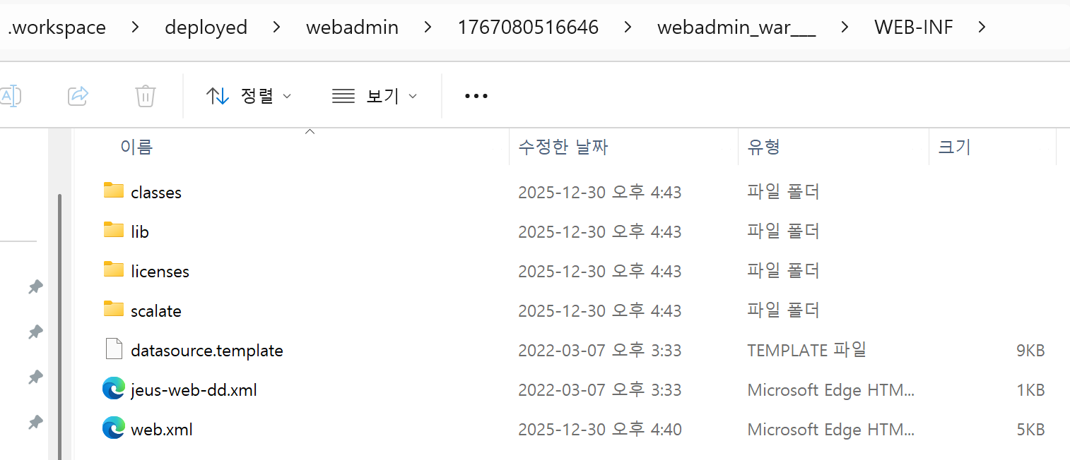 - JEUS_HOME/domains/jeus_domain/servers/adminServer/.workspace/deployed/webadmin/숫자/webadmin.war/WEB-INF 경로로 이동하면 web.xml 파일이 있는데 해당 파일을 열어 수정된 파일 내용을 확인하자.