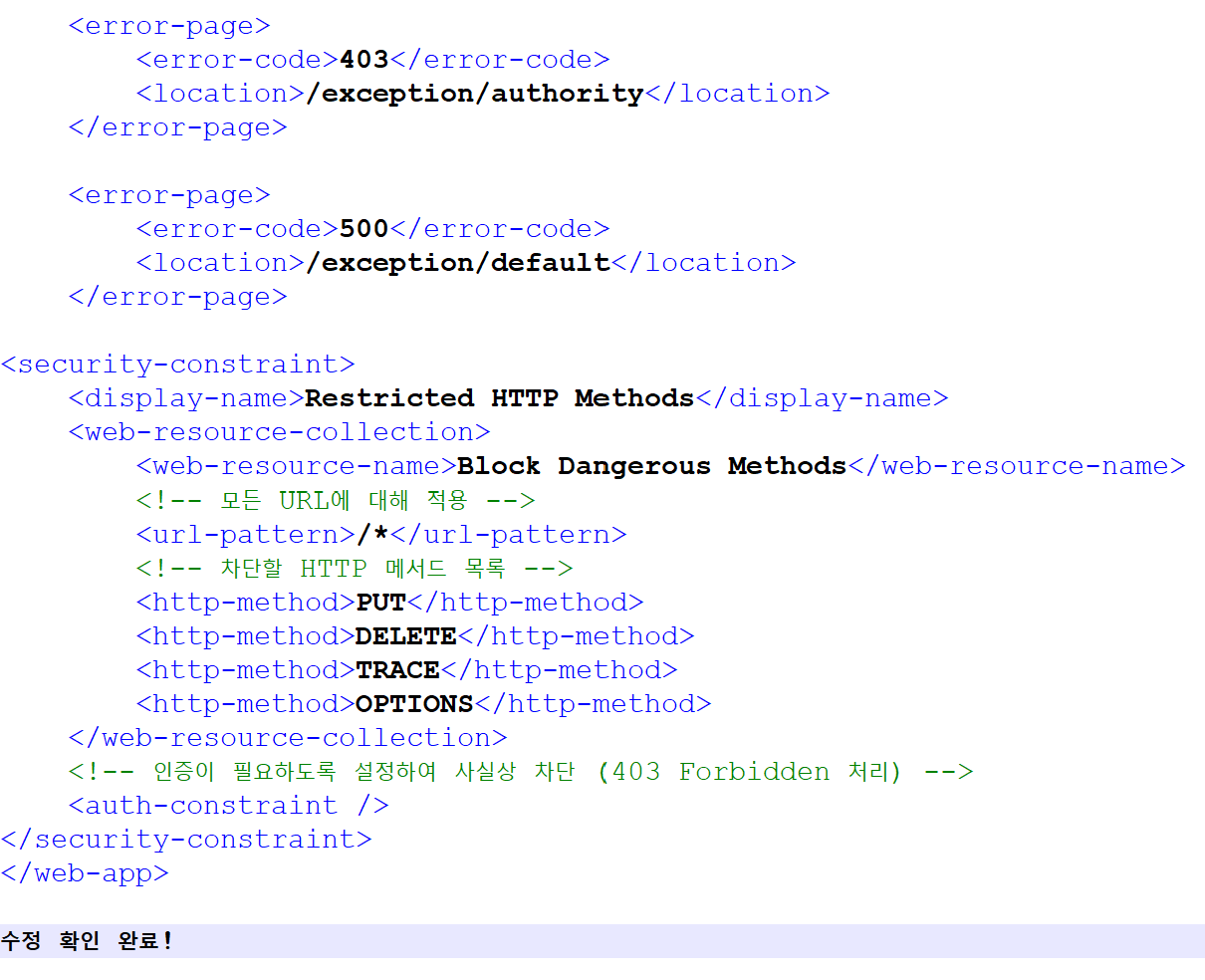 | <security-constraint> <display-name>Restricted HTTP Methods</display-name> <web-resource-collection> <web-resource-name>Block Dangerous Methods</web-resource-name> <!-- 모든 URL에 대해 적용 --> <url-pattern>/*</url-pattern> <!-- 차단할 HTTP 메서드 목록 --> <http-method>PUT</http-method> <http-method>DELETE</http-method> <http-method>TRACE</http-method> <http-method>OPTIONS</http-method> </web-resource-collection> <!-- 인증이 필요하도록 설정하여 사실상 차단 (403 Forbidden 처리) --> <auth-constraint /> </security-constraint> |