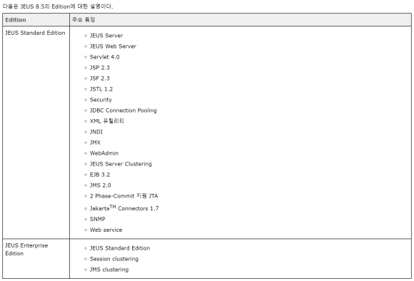 * Technet 에 명시된 라이선스에 따른 기능(JEUS 8.5 기준)