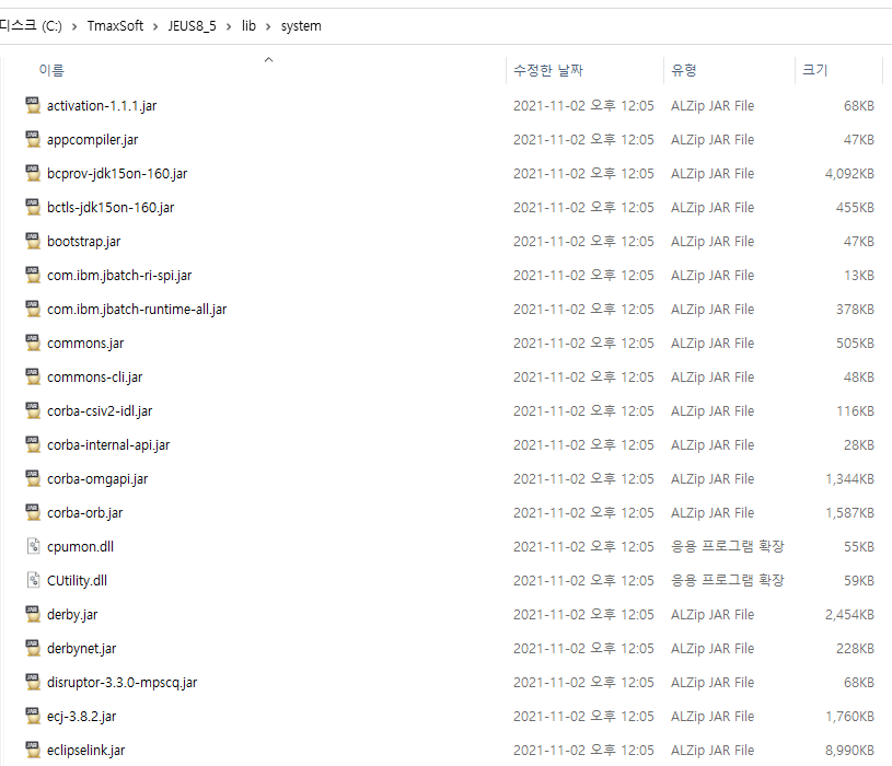 - JEUS_HOME/lib/system 경로에 가면 JEUS에서 불러오는 라이브러리들이 있는데 이 경로에 불러올 라이브러리나 so 파일 혹은 dll 파일을 넣으면 우선적으로 읽을 수 있다.
