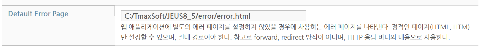 - 이외에 JEUS 에서도 error page 설정이 가능하며, 특정 에러코드를 지정하는 것이 아닌 모든 에러 상황에 대해 error page를 호출하도록 한다.